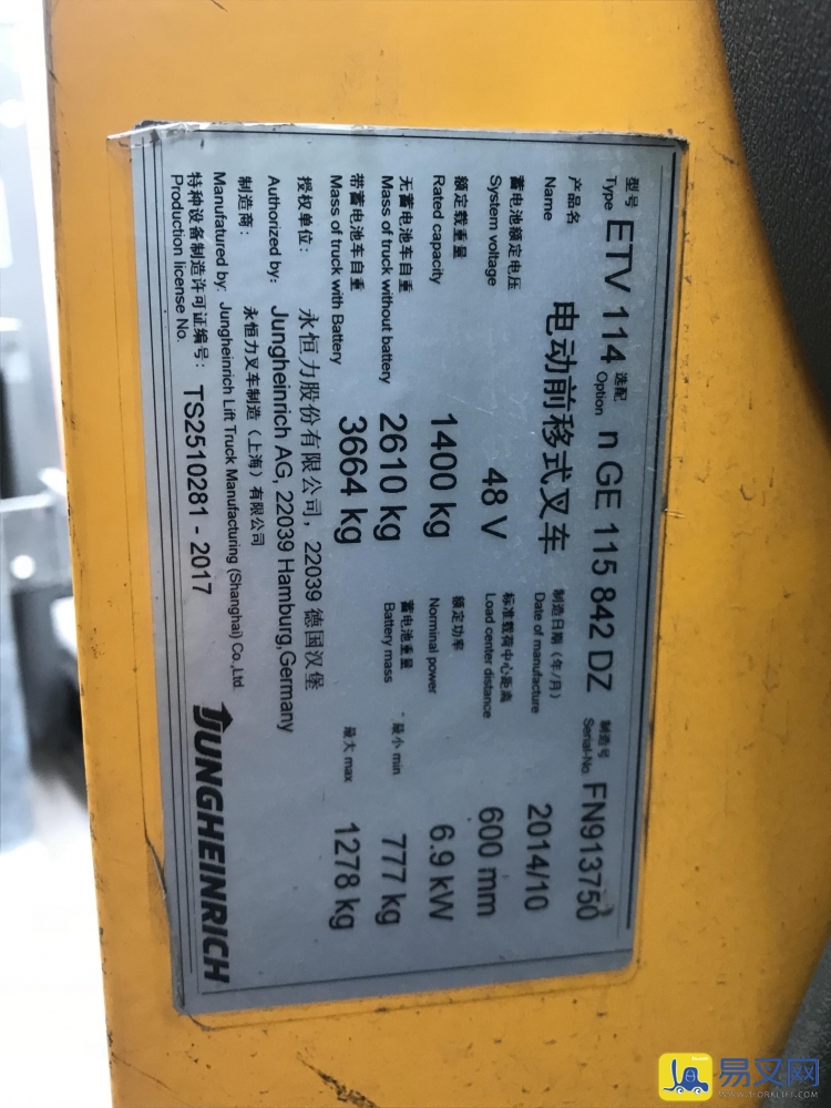 永恒力 ETV114,售价面谈,2014年出厂,小时数0